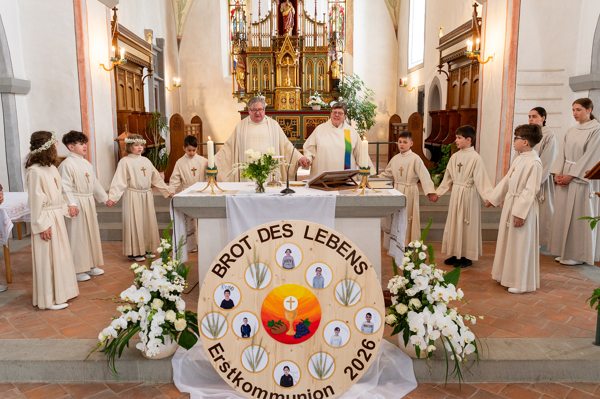 Sieben Kinder aus den Kirchgemeinden Homburg und Pfyn traten am Sonntag, 19. April zum ersten Mal an den Tisch des Herrn, um das Heilige Brot zu empfangen. Pater Jaroslaw begrüsste sie herzlich und lud sie zu Beginn ein, tief ein- und auszuatmen, um die Nervosität abzulegen und sich auf das bevorstehende Fest zu freuen. Dies brachte sichtlich eine erste Lockerung in die Gesichter der Kinder. Doch nicht nur auf Deutsch wurde begrüsst, zwei Erstkommunionkinder begrüssten auch in ihrer Muttersprache, auf italienisch und ungarisch.