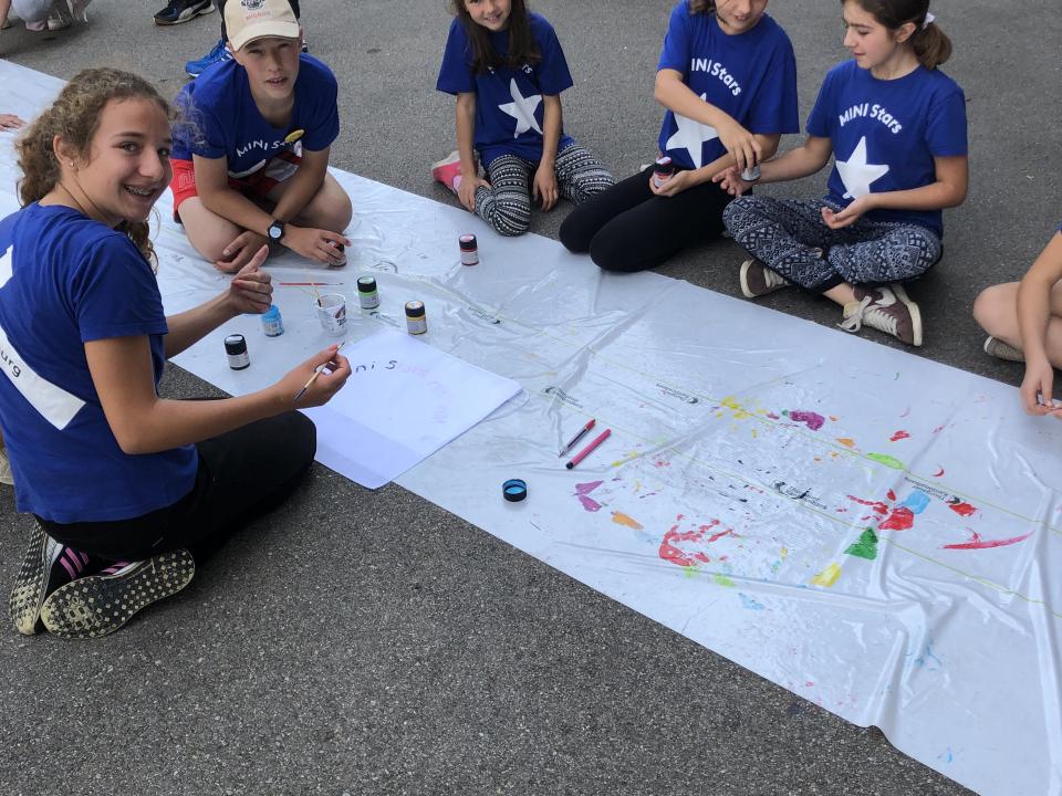 Mit Pommes und Hotdog zum Mittagessen ging es am Nachmittag gestärkt weiter. Die Verkleidungskiste war sehr gefragt und brachte uns alle zum Lachen, nicht nur die Clowns. Gemeinsam eine Fahne zu malen ist eine Herausforderung. Wer kann gut Zeichnen und wer hat die kreativste Idee? Gemeinsam entstand ein kleines Kunstwerk. Um 16 Uhr wurde das olympische Feuer dann wieder gelöscht und alle machten sich auf den Heimweg.
