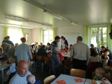 Im Anschluss waren alle herzlich zum Znüni im Pfarrsäli eingeladen, welcher das Team vom „Fiire mit de Chliine“ vorbereitete. Am Buffet oder am Tisch entstanden bereits die ersten Gespräche, zum Teil lerne man sich auch neu kennen oder merkte erst, dass man Kinder im gleichen Alter hatte. Für die Kinder stand eine grosse Lego-Kiste und Puzzles bereit, so dass sich alle bestens unterhielten.